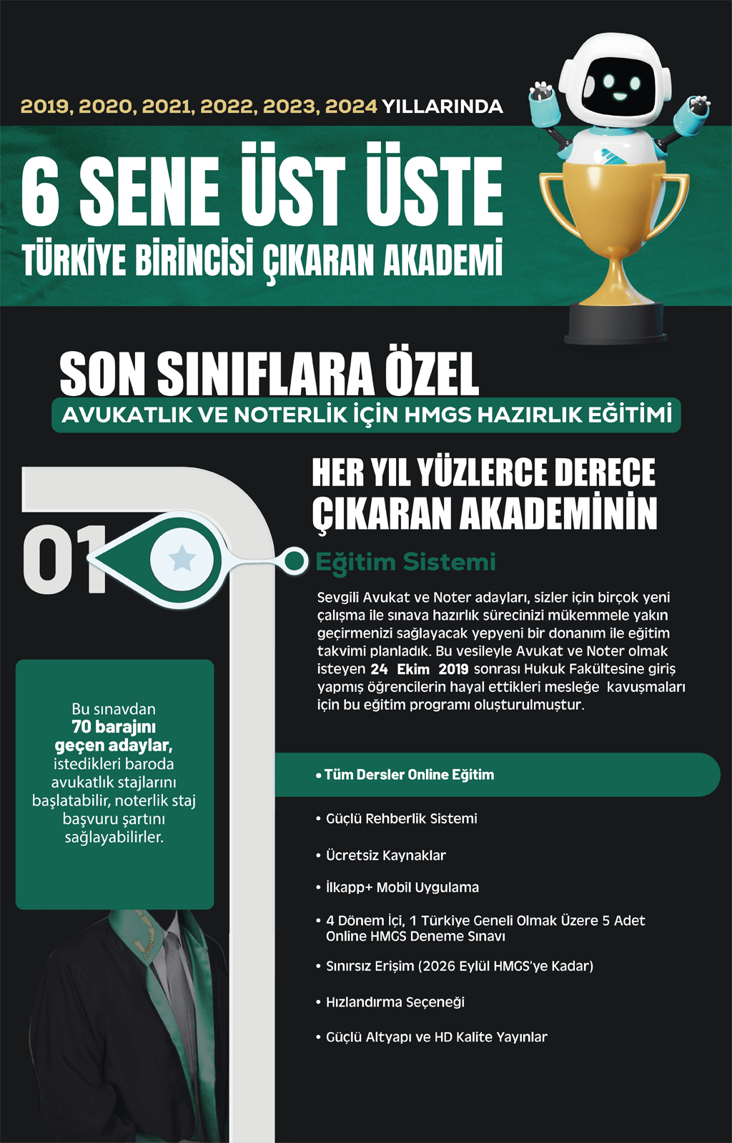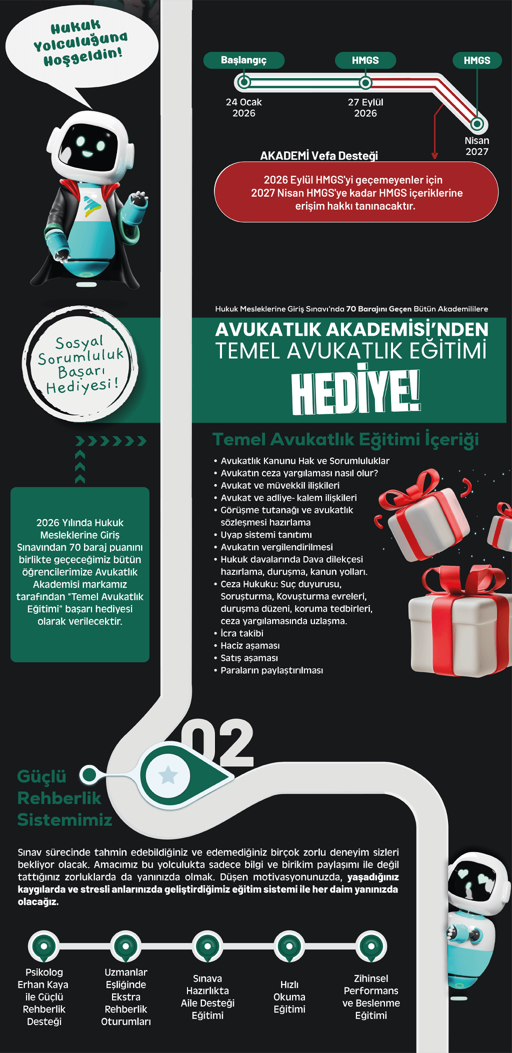 24 Ekim 2019 tarihi sonrasında fakültesinden mezun olan bir öğrenci eğer Hâkim/Savcı olmak istiyorsa, öncelikli olarak HMGS’ye girecek ve 70 baraj puanını geçecektir. Bu sayede Hâkim/Savcı Yardımcılığı Sınavına girme hakkı elde edecektir. Dolayısıyla Hâkim/Savcılık mesleği için 2 aşamalı bir sınav var diye düşünebiliriz. Hâkim/Savcı Yardımcılığı ve mesleğe dair merak edilen her konuda Akademi danışmanlarından destek alabilirsiniz.