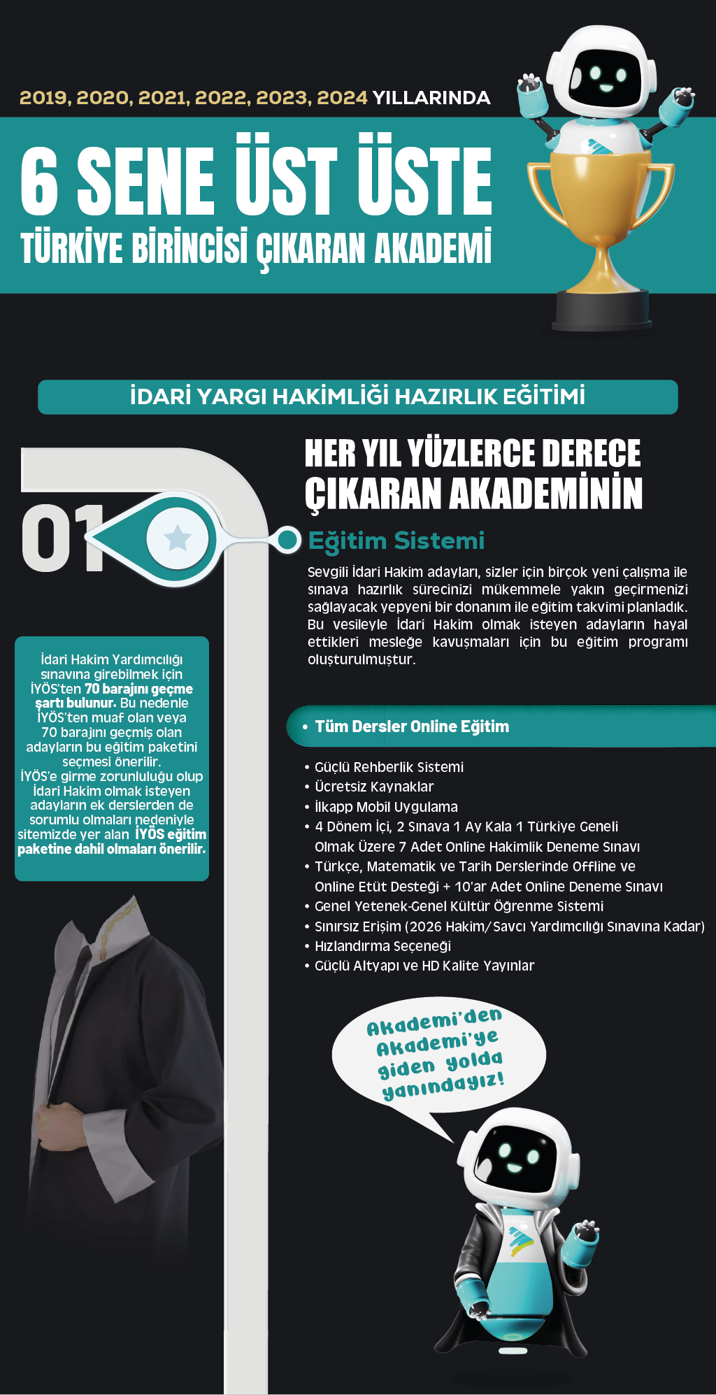 İdarî yargı hâkim yardımcıları için; Hukuk fakültesinden mezun olmak veya yabancı bir hukuk fakültesini bitirip de Türkiye’de hukuk fakülteleri programlarına göre eksik kalan derslerden sınava girip başarı belgesi almış bulunmak, hukuk fakültesinden mezun olanlar dışından alınacak adaylar bakımından, her dönemde alınacak aday sayısının yüzde yirmisini geçmemek üzere, hukuk bilgisine programlarında yeterince yer veren siyasal bilgiler, idari bilimler, iktisat ve maliye alanlarında en az dört yıllık yüksek öğrenim yapmış veya bunlara denkliği kabul edilmiş yabancı öğretim kurumlarından mezun olmak,